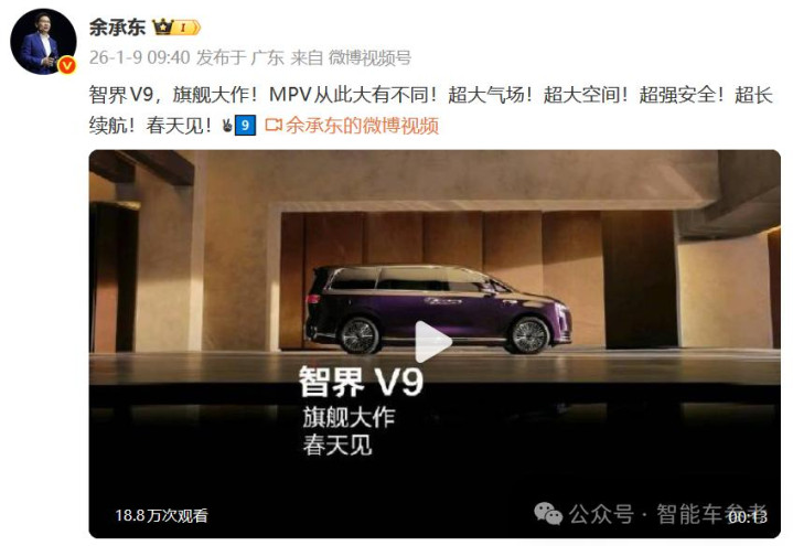 余承东将智界V9称为“旗舰大作”,透露今年春天上市。