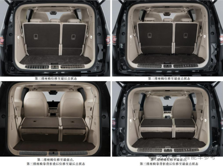 第二、三排座椅靠背都可以前后滑动,第三排还能折叠在坐垫上。